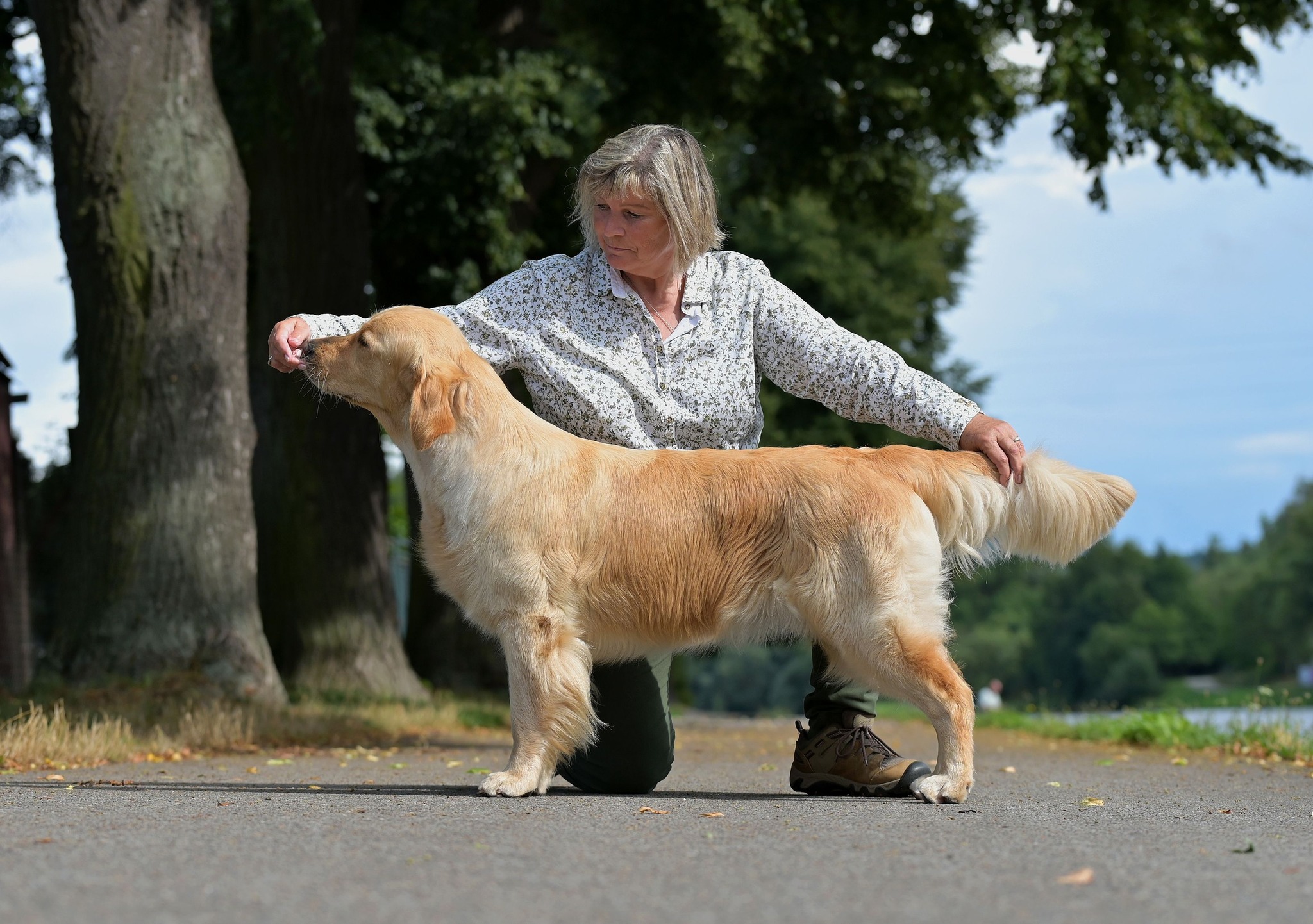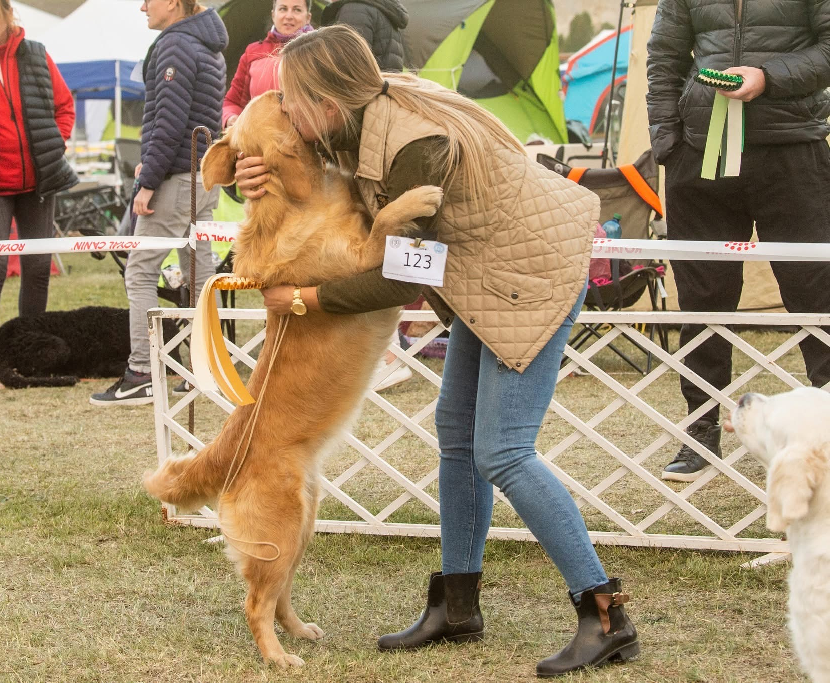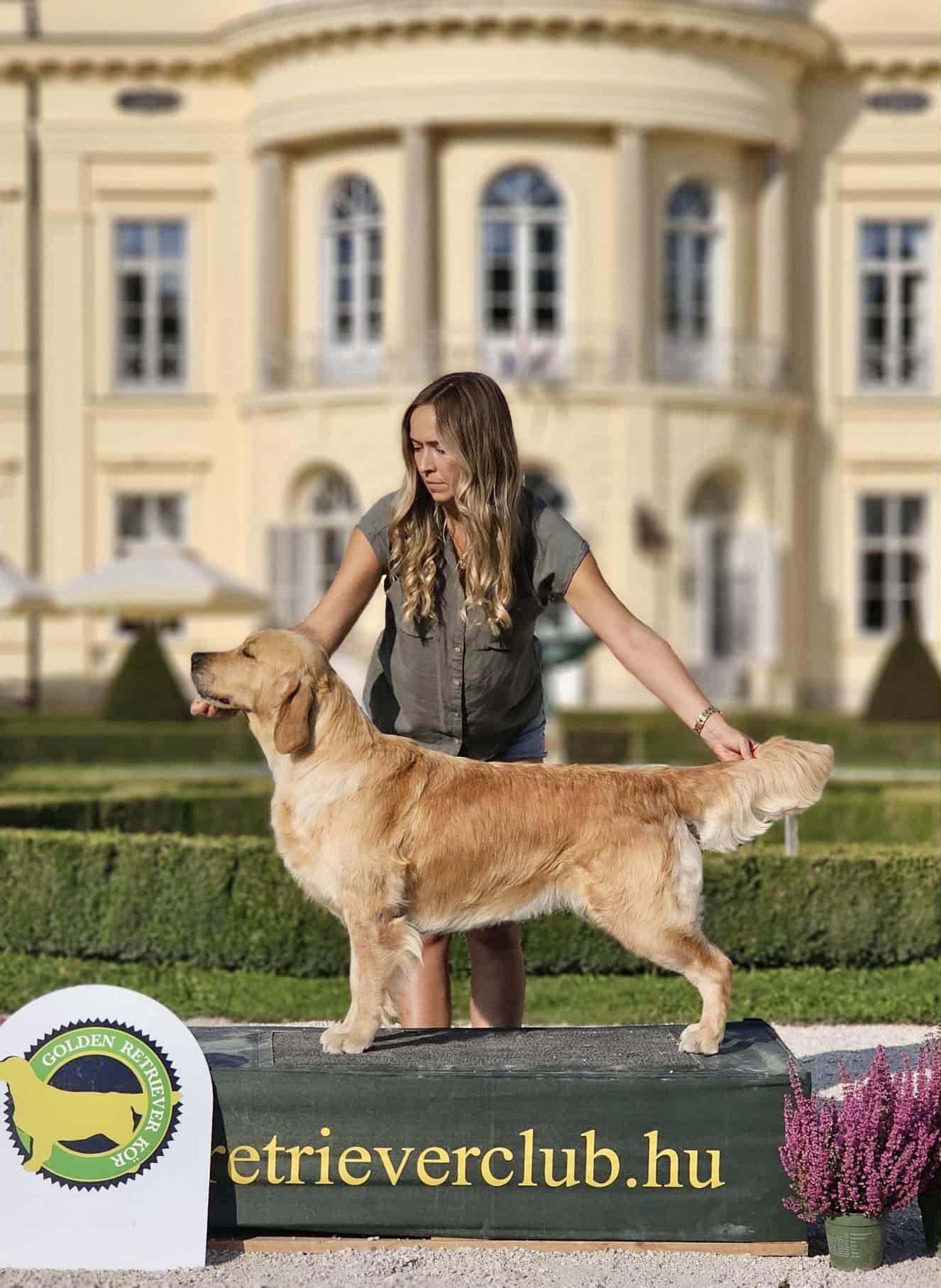 Po skúškach sme sa rýchlo presunuli na poobednú výstavu do maďarkého Komáromu, kde bola prihlásená iba Lilibet. Naše plemeno posudzovala anglická rozhodkyňa Mrs. Jane Wild, ktorej sa Lilibet veľmi páčila a spomedzi viac než 100 prihlásených Golden retrieverov získala titul BOB - najlepší jedinec z plemena! V záverečných súťažiach sa taktiež nestratila a obsadila pekné 4. miesto!