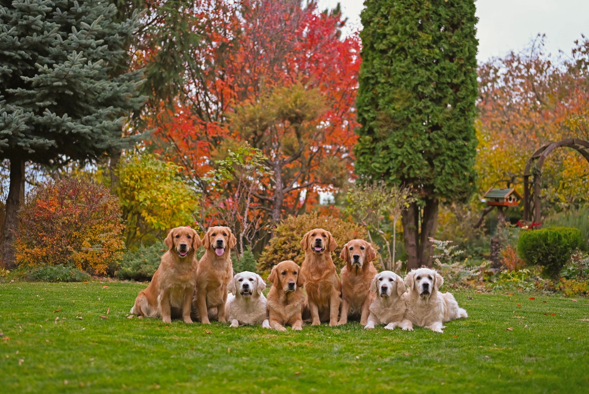 Na fotografii z ľava: FOUR ROSES Canis Regnum "Rose", IMPERIAL QUEEN Canis Regnum "Lilibet", GOLDEN STAR Canis Regnum "Zara", CROWN ROYAL Canis Regnum "Lara", LEGEND OF GOLD Canis Regnum "Roxy", Power Of Gold Brdské zlato "Ruby", BRIGHT DIAMOND Canis Regnum "Meggy", Ocean Pirate Brdské zlato "Jack".