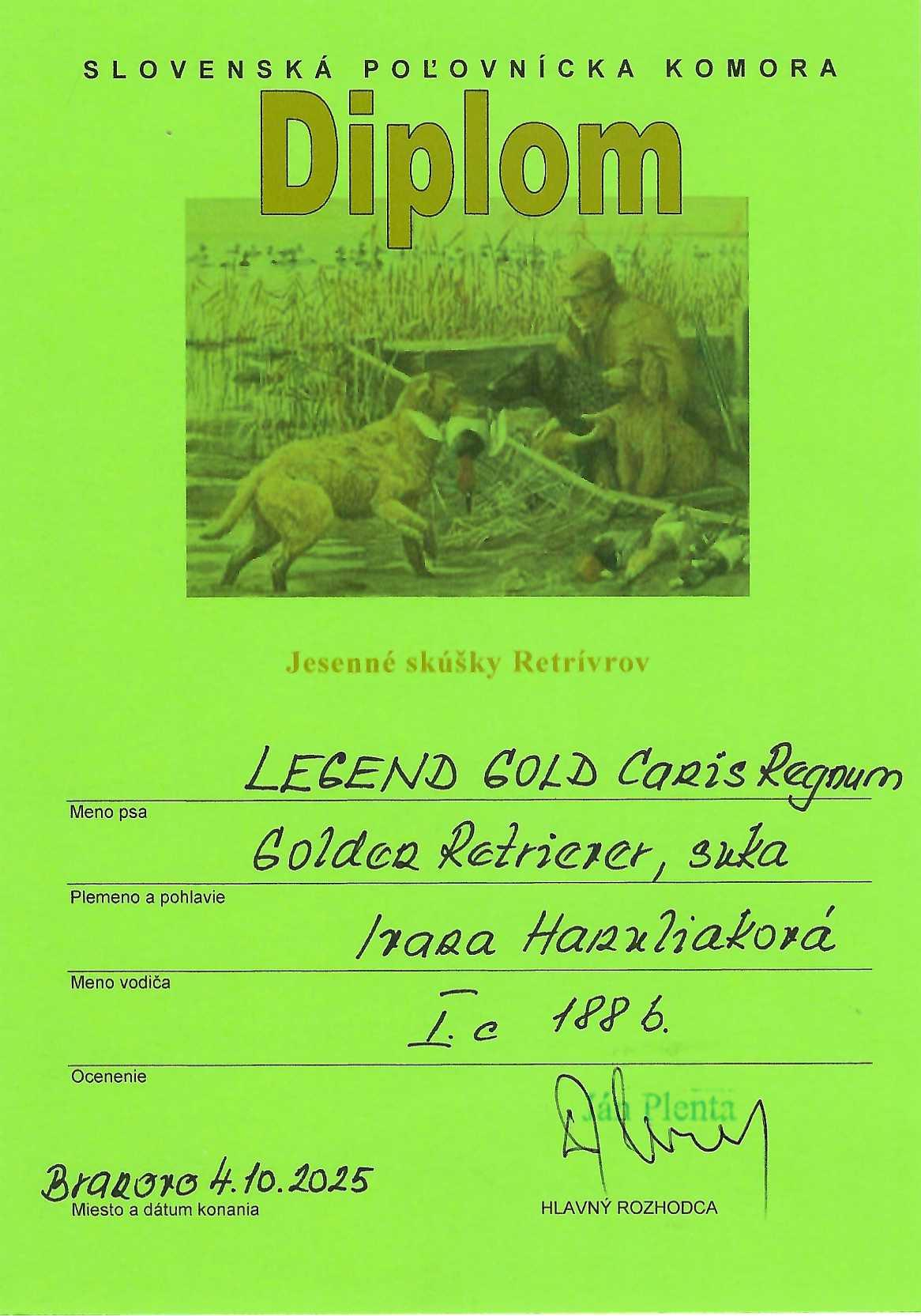 Posledný septembrový víkend sme spolu s Meggy - Bright Diamond Canis Regnum úspešne absolvovali náročné dvojdňové skúšky. V sobotu prebiehalo posudzovanie práce na poli a vo vode, kde Meggy stratila iba jeden bod pri disciplíne naháňanie v tŕstí. V nedelu zvládla všetky disciplíny v lese na plný počet bodov, na základe čoho skončila v 1. cene s titulom CACT. Meggy sa tak stáva čakateľkou titulu Slovenský šampión práce!