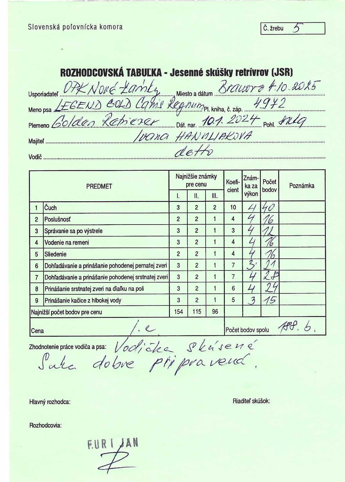 S Meggy - Bright Diamond Canis Regnum sme sa dnes zúčastnili na JSR v Komjaticiach, ktoré organizoval Slovenský športový klub retrieverov. Meggy pracovala veľmi pekne, v tabuľke má iba dve 3, inak všetky disciplíny zvládla za 4 - teda na plný počet bodov. Na týchto skúškach získala celkom 187 bodov, čím skončila v 1. cene. Ďakujeme klubu za skvelú organizáciu skúšok a rozhodcom za korektné posudzovanie!