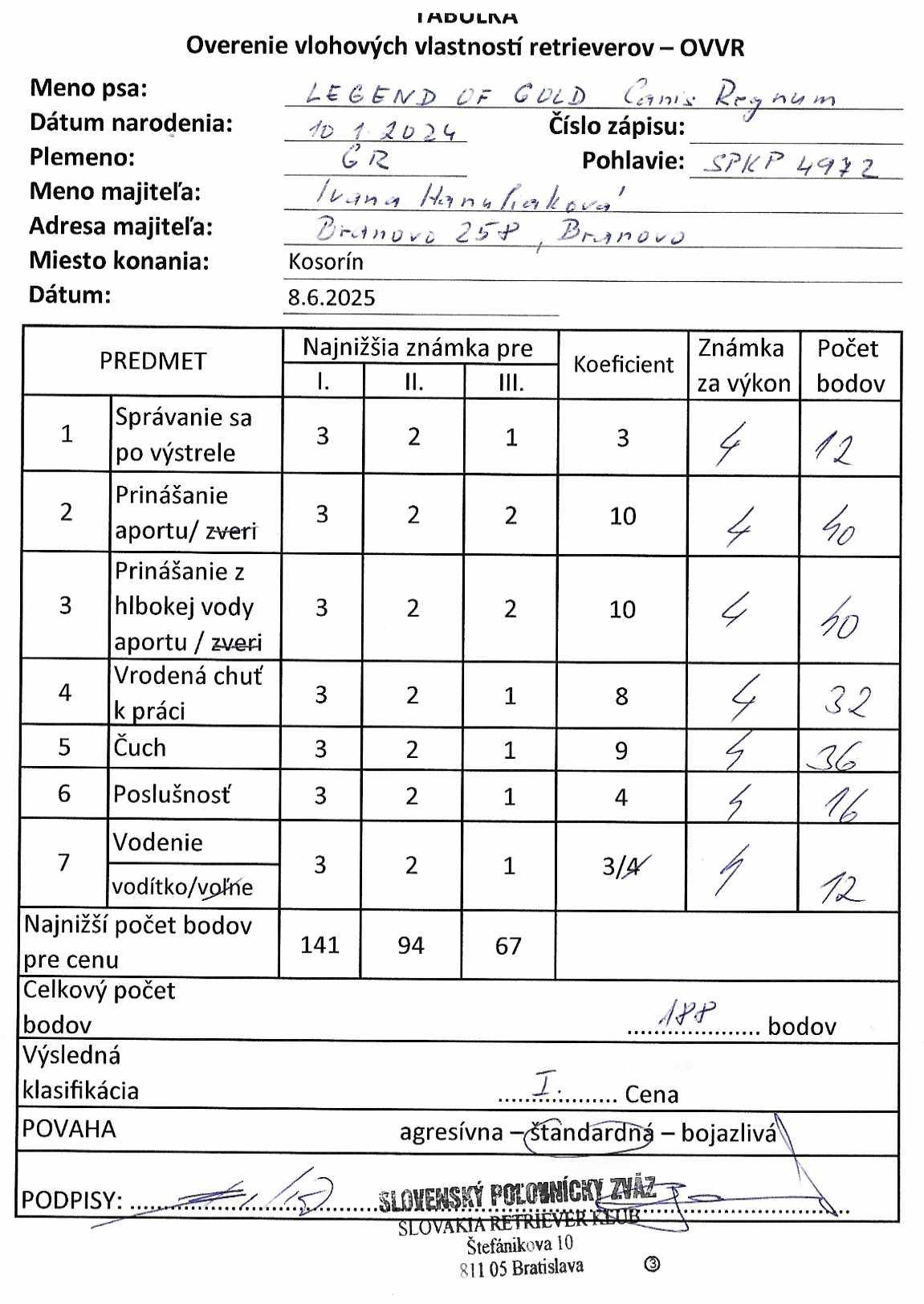 LEGEND OF GOLD Canis Regnum "Roxy" absolovovala svoje prvé pracovné skúšky - darilo sa jej výborne a zvládla ich dokončiť s počtom bodov 188 v prvej cene!